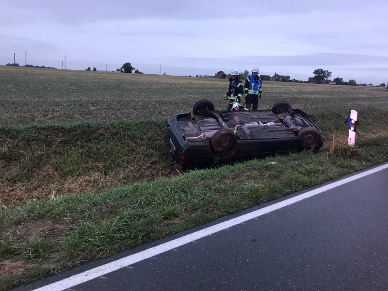 Aus bislang ungeklärter Ursache kam der Fahrer eines PKWs nach rechts von der Straße ab. Der PKW überschlug sich und blieb anschließend auf dem Dach im Graben liegen.