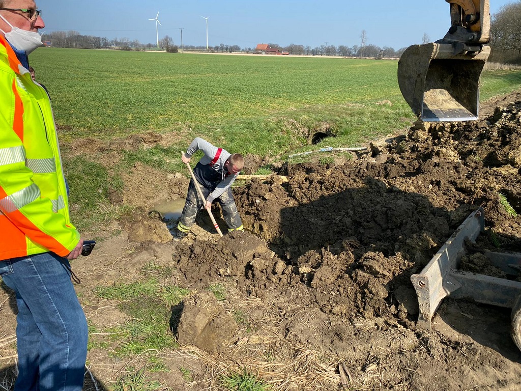 Mit Hilfe eines Baggers konnte die genaue Austrittsstelle lokalisiert und die Drainage an dieser Stelle zum Vorfluter hin gekappt werden. In Absprache mit der Unteren Wasserbehörde des Kreises Soest wurde dort ein improvisierter Ölabscheider gebaut. Die Feuerwehr setzte weiterhin insgesamt sechs Ölsperren auf einer Länge von 700m in den Vorfluter. Diese müssen die nächsten 2 - 3 Tage zunächst im Vorfluter verbleiben.