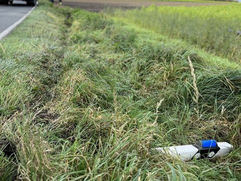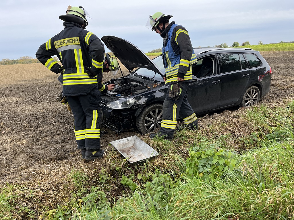 Aus bislang ungeklärter Ursache kam der Fahrer eines PKW von rechts von der Fahrbahn ab, fuhr rund ca. 100m durch einen Graben und kam auf einem Feld zu stehen.