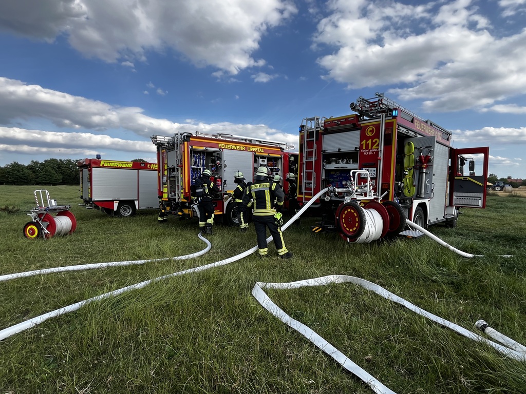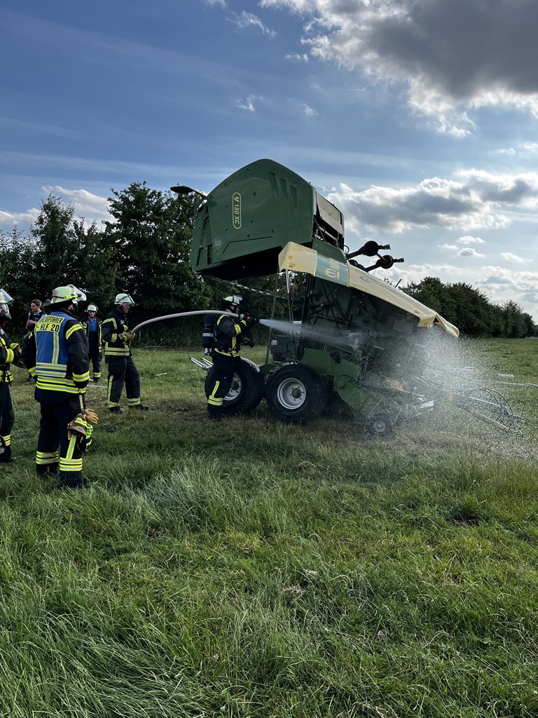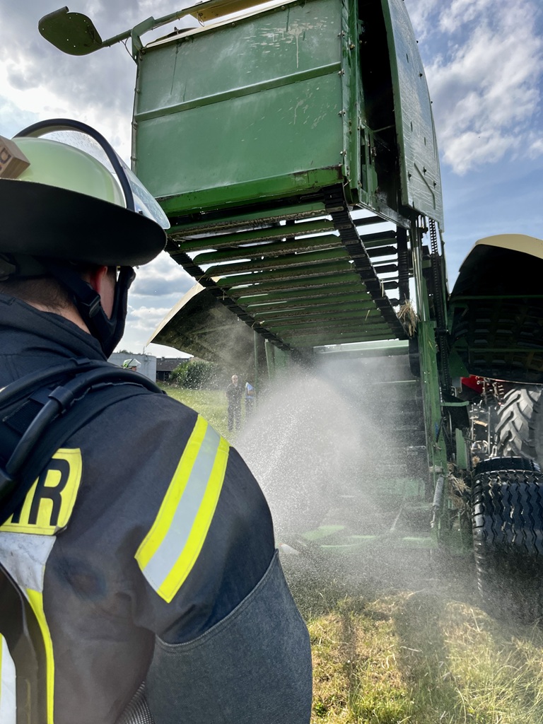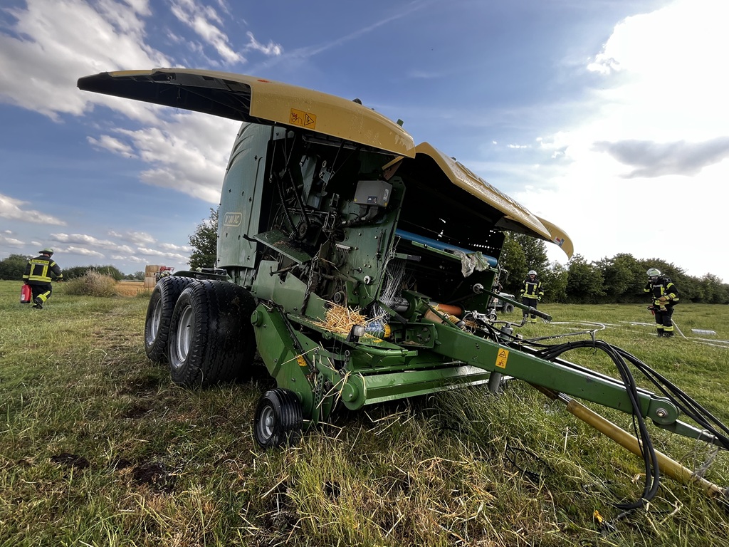 Der Fahrer einer Rundballenpresse bemerkte beim Pressen von Stroh eine Rauchentwicklung aus der Maschine. Er reagierte sofort, entleerte die Maschine und stellte diese auf einer angrenzenden Wiese ab. Dadurch konnte eine größere Ausbreitung auf das Feld verhindert werden.
