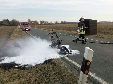 Aus ungeklärter Ursache fing ein Motorroller während der Fahrt Feuer. Bei eintreffen der Feuerwehr stand der Roller bereits in Vollbrand. Die Feuerwehr löschte den Brand mittels Schaumpistole. Anschließend wurde die Fahrbahn durch die Feuerwehr gereinigt. [MS]