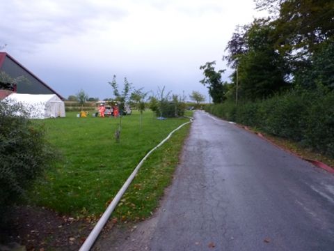 Angenommen wurde der Brand einer Stallung in der sich noch zwei Personen befinden sollten. Aufgrund der vorgefundenen Lage wurde bereits nach der Erkundung eine Alarmstichwortänderung auf Brand 3 sowie eine weitere Alarmstufenerhöhung veranlasst. Somit waren alle Lippetaler Einheiten sowie das DRK Lippetal alarmiert. Die Kameraden der Feuerwehr Welver, die für den Bereich der Gemeinde Lippetal den Bereitstellungsraum führen, wurden im Vorfeld über die Übung informiert und waren bereits im Bereitstellungraum eingetroffen.