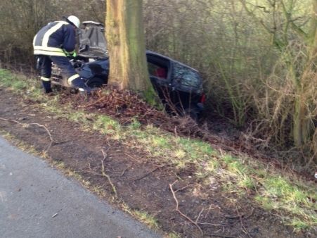 Aufgrund einer spiegelglatten Fahrbahn kam eine junge Frau mit ihrem PKW von Lippborg kommend in einer leichten Linkskurve von der Fahrbahn ab und blieb auf der gegenüberliegenden Seite in einem Graben seitlich vor einem Baum stehen.