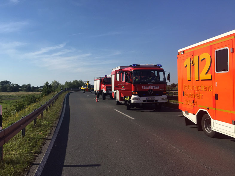 Die Feuerwehr unterstützte den Rettungsdienst bei der Versorgung des Patienten, sicherte den Brandschutz an der Unfallstelle und sperrte die Fahrbahn für die Rettungs- und Bergungsmaßnahmen sowie zur Landung des Rettungshubschraubers weiträumig ab. Im Anschluss wurde die Fahrbahn gereinigt.